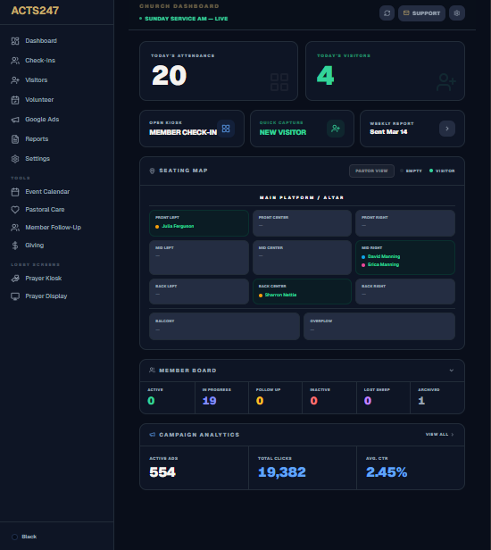 Acts 2:47 — the Lord added to the church daily. We built the Dashboard around making sure your team is ready for every person He sends.